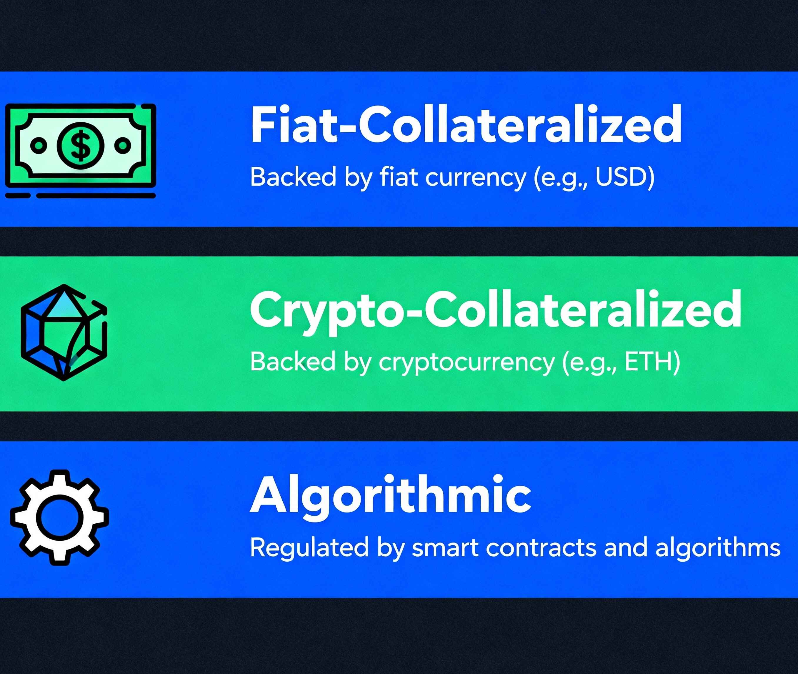 Stablecoins are digital assets designed to maintain a consistent value typically pegged to stable real-world references, including: